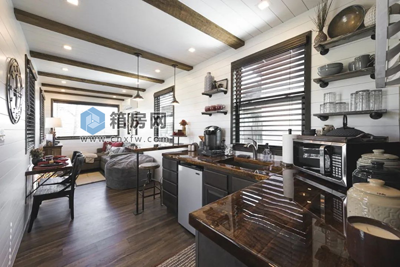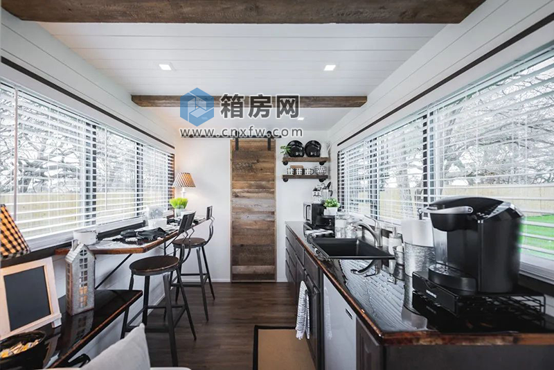 室內(nèi)設(shè)有開放式起居區(qū)和廚房,定制的木制窗戶提供自然光線。室內(nèi)樓梯可以通往樓上。