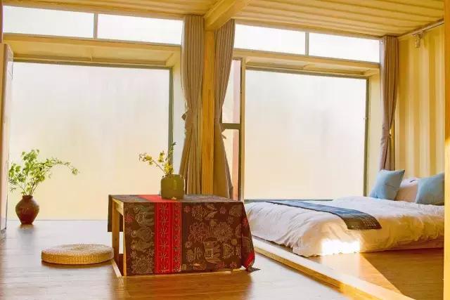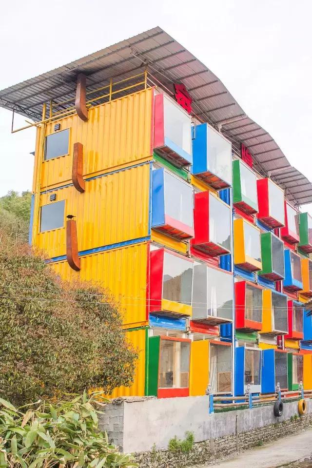 初見畬隱就有一種驚艷的感覺,畬隱的客房由12個集裝箱組成,外表被涂成七色彩虹,遠遠望去猶如架在山水田園間的彩虹橋,達到了工業風和田園風的完美結合。