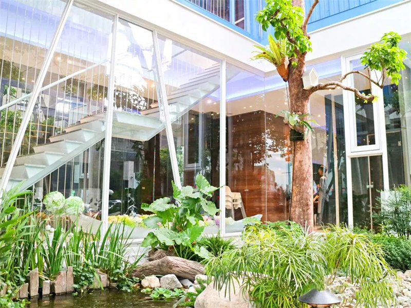 三層樓的設計皆不相同,一樓以密集板加上2D激光,打造出海浪輕涌的造型。門前利用與人行道相接的一小塊空地規劃生態池、種植茄苳。路人經常被外觀所吸引。