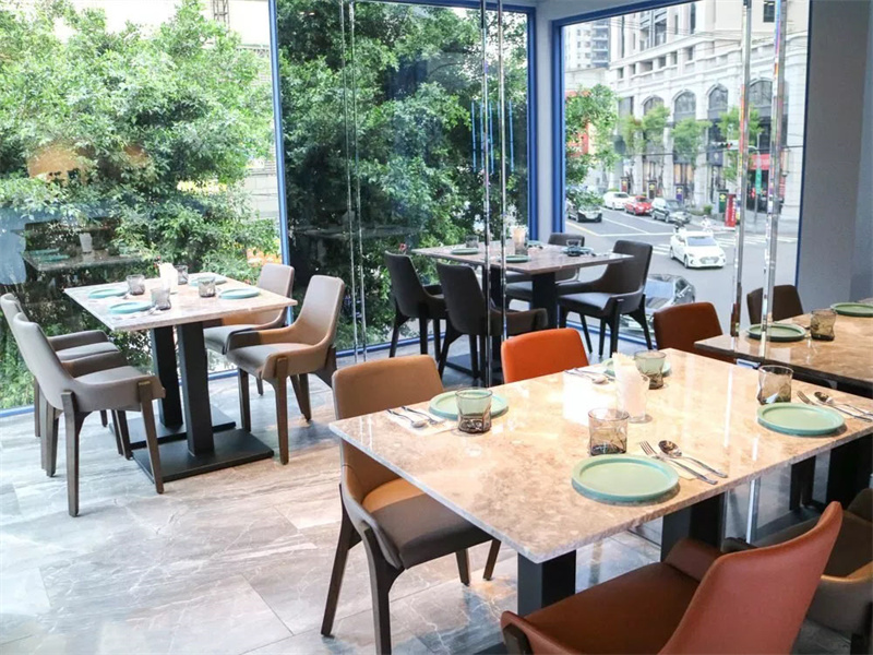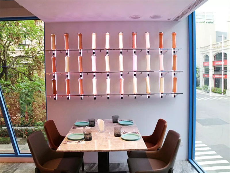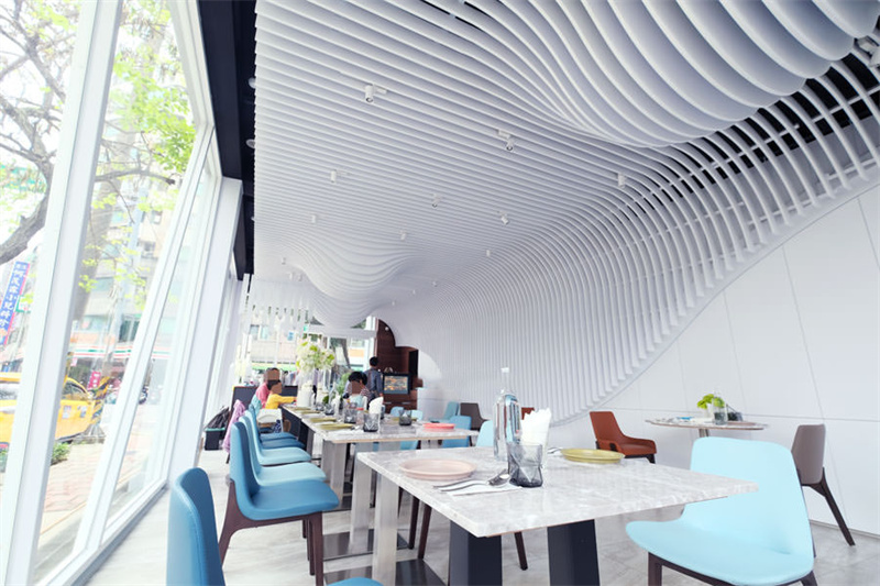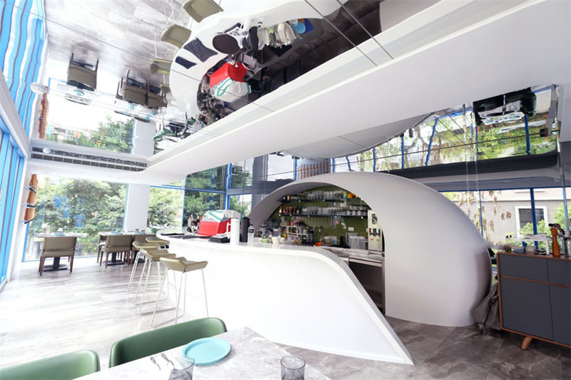 一樓主要為落地玻璃的透光設計,靠墻一邊的天花是片狀材料拼成的水滴型裝飾,極具現代感和藝術線條美,讓環境瞬間變得高大上起來,引起視覺上的愉悅,有利于顧客用餐心情。