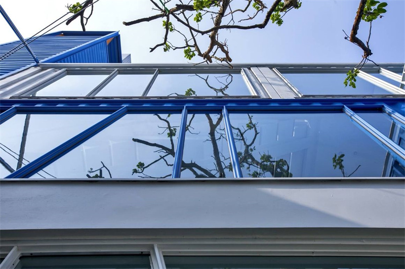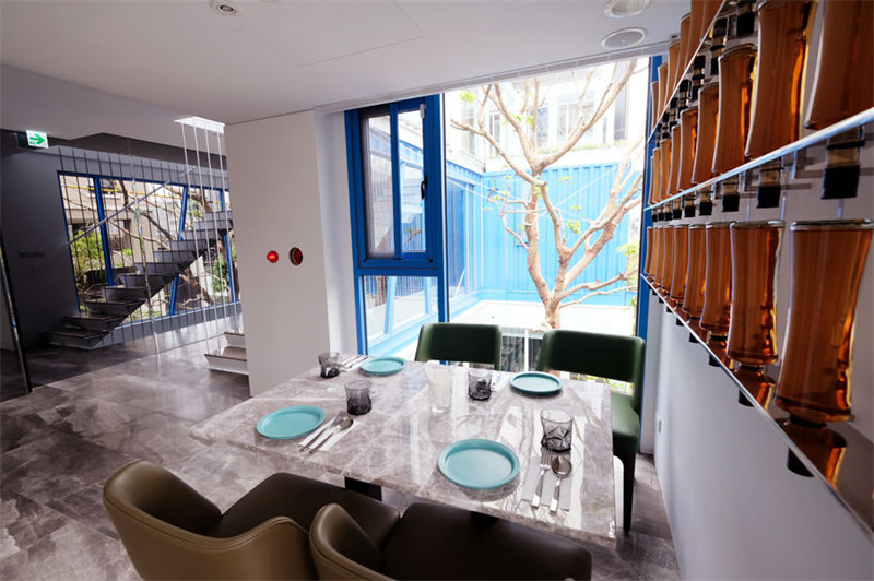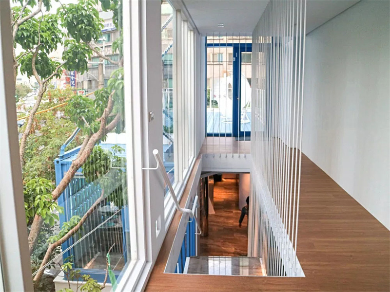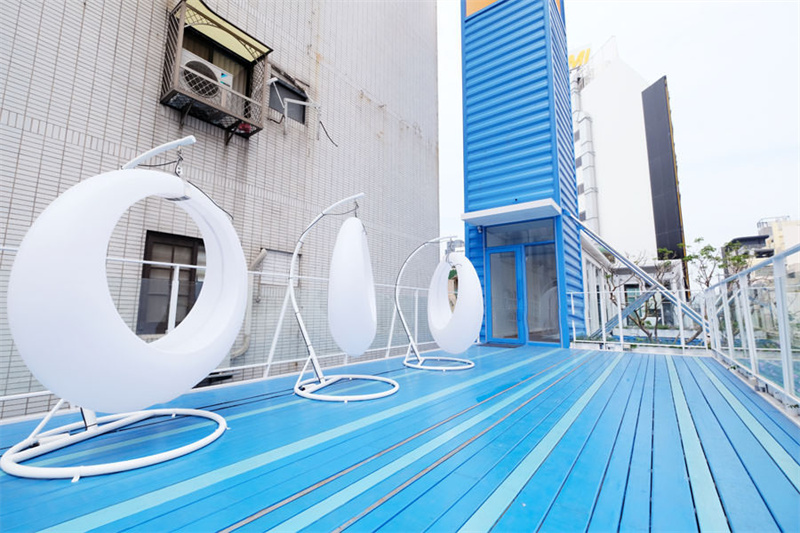 看到如此熟悉的紋路,就應該知道這又是一家集裝箱改造而成的三層建筑了。然而事實是建筑的外表僅以集裝箱鐵皮作為裝飾,實則為鋼骨結構。外觀以藍白為主,形似一艘大船停泊在路邊。
