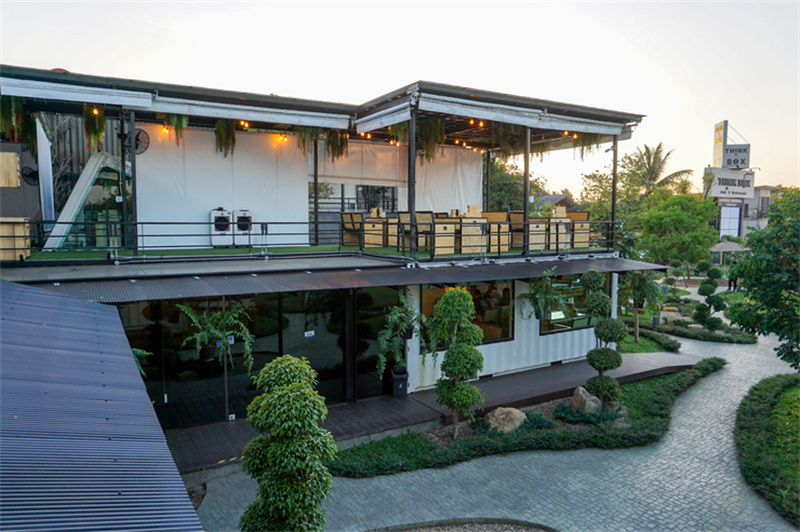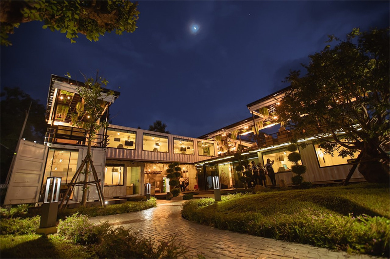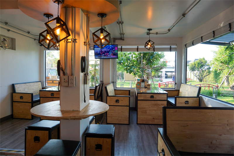 餐廳內(nèi)部空間由兩個或者多個集裝箱打通使用,形成了寬敞的活動空間。建筑內(nèi)擁有會議室和研討室等多種空間布局,大小的房間為顧客提供各種活動場地,包括戶外草坪為尋找婚禮場地的人提供了一個優(yōu)美的環(huán)境,私人英式花園是浪漫的場地。