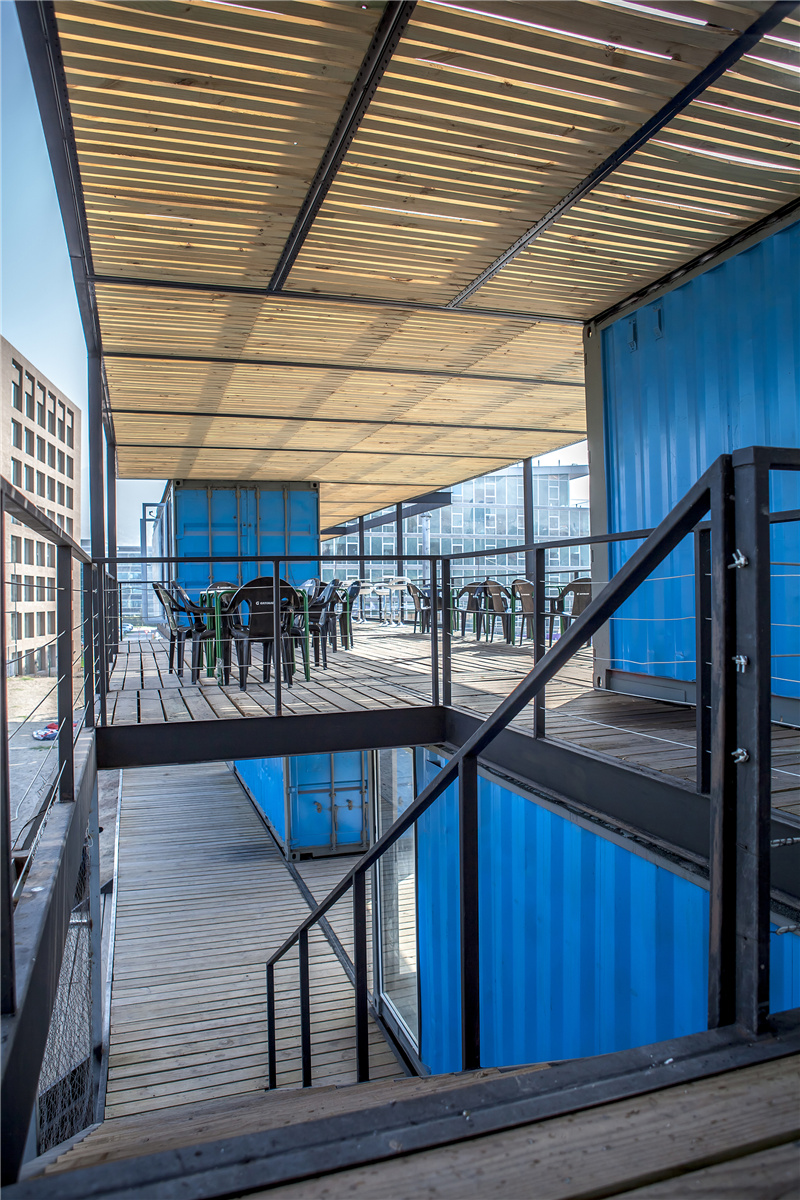 整體上,以集裝箱為主體,鋼結(jié)構(gòu)的框架可以作用在11個抗震結(jié)構(gòu)上。獨(dú)特的建筑風(fēng)格,通過一系列的設(shè)計,縱向容納不同的室內(nèi)和陽臺。