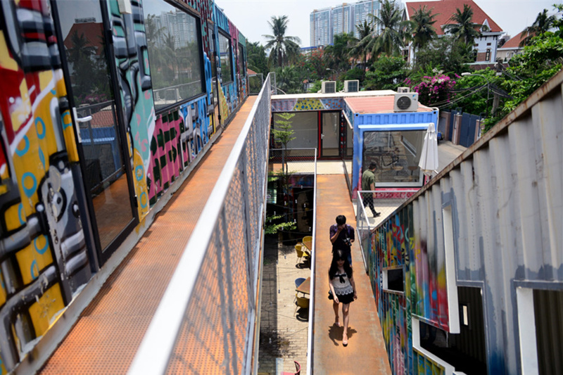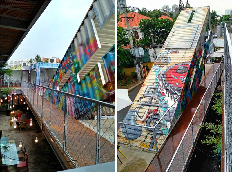 個(gè)性的涂鴉展現(xiàn)年輕活力,傾斜擺放的貨柜樓梯是一大亮點(diǎn),成了最近當(dāng)?shù)厍嗄昱恼沾蚩ㄖ亍?