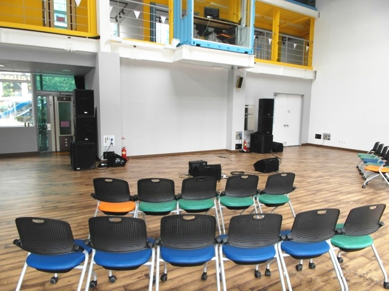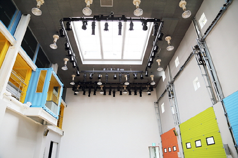 作為主要公演場地,“熱鬧樓”規模并不大,但內部設施與一般演出場所及展覽廳相比毫不遜色。這里是一棟萬能娛樂樓,提供公演、展覽、講演、討論會、電影放映等。天窗開閉式公演場的最大特色在于,空間可根據實際需要隨意調整,且為自然采光照明,迎合了傾向于另類創作的年輕藝術家的感性路線。為打造一個從外部也可欣賞到展覽的效果,整樓采取全玻璃設計,沙上站一帶可盡收眼底。
