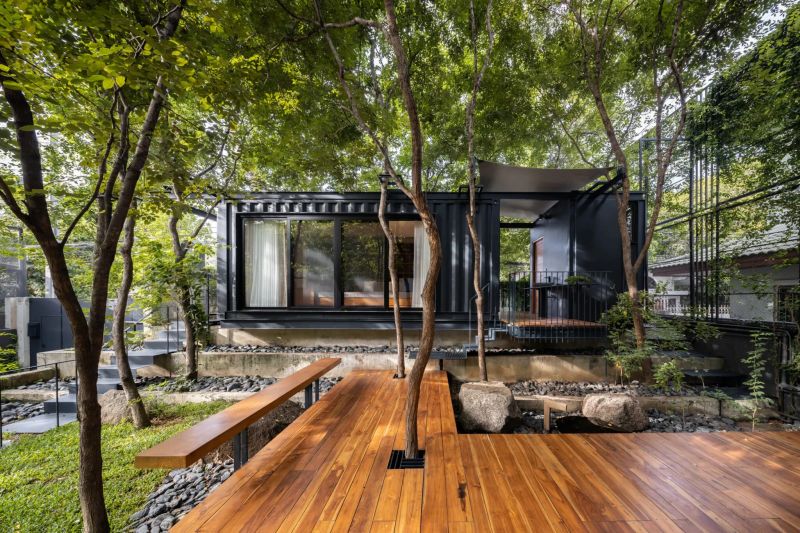在郁郁蔥蔥的寧靜和平氣氛中,這座房子卻位于繁華的城市中心。房屋本身的特點(diǎn)是使用黑色的集裝箱模塊作為房屋和工作室。房屋的入口擁有柚木地板、混凝土板、帶有大礫石嵌件的花園人行道等,將花園與房屋的樓梯相連。花園里的車庫屋頂上有一個(gè)洞,可以讓樹木穿過二樓生長,同時(shí)起到支撐的作用。