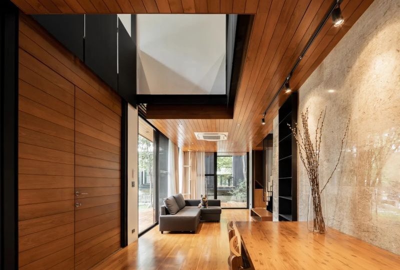 該房屋內(nèi)大多數(shù)樹木的種植時(shí)間都在3-4年,因此它們十分結(jié)實(shí)。負(fù)責(zé)該房屋項(xiàng)目的建筑公司具有花園設(shè)計(jì)專業(yè)知識(shí),因此通過將露臺(tái)和開口連接起來,設(shè)法將花園、鐵房和工作室在內(nèi)的所有東西結(jié)合在一起,把熱帶花園的本質(zhì)融入每一個(gè)視圖,使住戶無論是坐在房子前面,還是走到二樓的樹梢附近,都可以透過窗戶看到綠色的空間,感覺就像是插入了紅木和綠植花園的房屋。