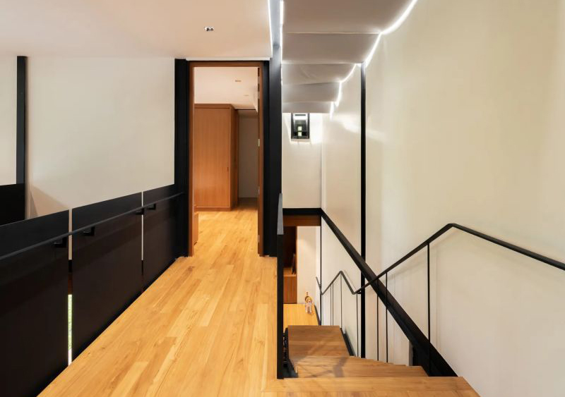 樓梯下的鋼制儲(chǔ)物架創(chuàng)造了額外的存儲(chǔ)空間,作為欄桿的鋼筋,它是木材與金屬的完美結(jié)合。二樓樓梯的頂部是一個(gè)天窗,在晴朗的日子可以露出天空,與樹木和諧相處;在不需要的時(shí)候則可以拉上窗簾,保持陰涼。