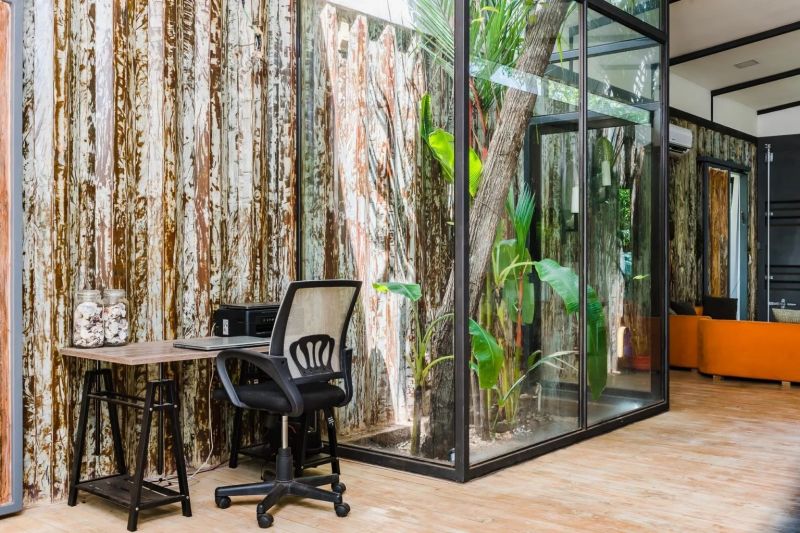 該集裝箱房屋的內(nèi)部整體設(shè)計非常簡單,用來粉刷容器的顏色則十分獨特,用仿樹木紋路的柔和色彩是正確的選擇。此外,客廳內(nèi)的一個亮點成為了整座房屋的“點睛之筆”——房屋原址的樹木得到了最好的保存,用景觀櫥窗圍起能得到親近自然的感官享受。