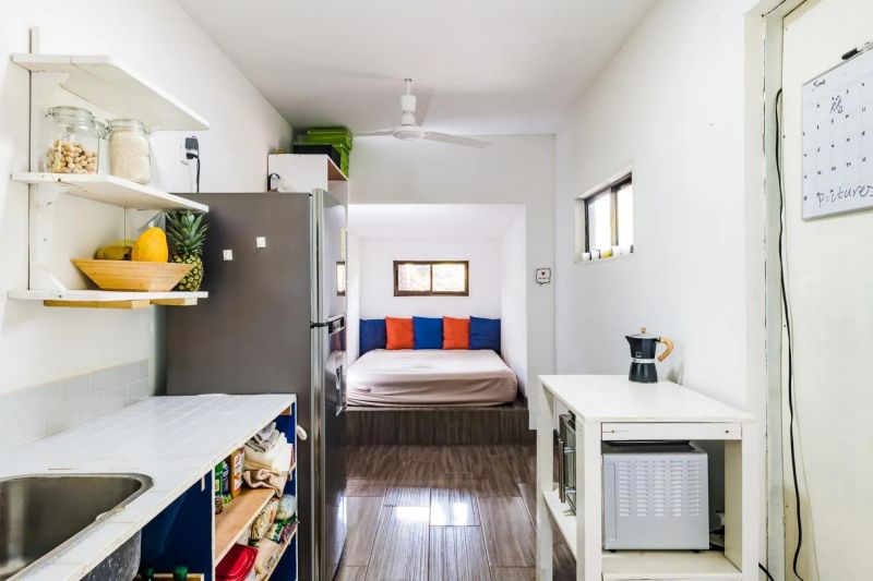 進入該集裝箱住宅的內(nèi)部,你可以看到房間的入口是一道從集裝箱上切割下來的零件制成的滑動門。房屋兩側(cè)的窗戶和天花板的天窗都為室內(nèi)帶來了充足的光線,使兩個集裝箱之間的大廳明亮且寬敞。