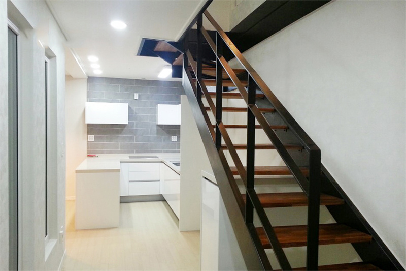 底層的空間主要用作客廳、廚房和衛(wèi)生間等,布局緊湊,風(fēng)格簡(jiǎn)約。如果想要到二層的臥室就要從廚房邊上的樓梯上去,設(shè)計(jì)比較窄小,有利于節(jié)省空間,底下還能放冰箱什么的。