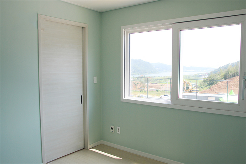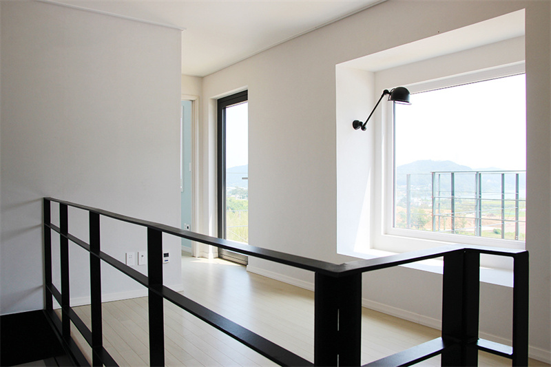 到了二層,是一個(gè)擁有多窗的環(huán)境,因此這里十分明亮。你可以看到走廊上有一扇窗戶往外凸,形成一個(gè)可以靠窗坐著的空間,上面還特地安裝了一盞燈。其實(shí)這是故意的設(shè)計(jì),為此還多改造了一塊集裝箱壁。而門外便是陽臺(tái)。