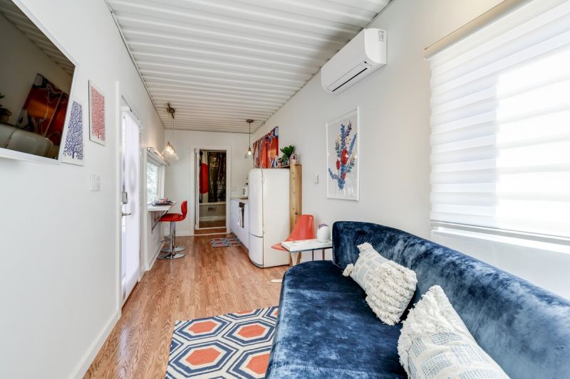 縱觀集裝箱房的整體,我們可以看到白色和木質(zhì)兩者簡單完美的和諧。以一定角度切割的玻璃為房子增添了一種獨特的美,還能為室內(nèi)空間帶來自然光線。這所房子的內(nèi)部裝修十分簡單,但也和外觀一樣時尚,客廳中部放置的天鵝絨的藍色沙發(fā)提高了不少品質(zhì)和格調(diào)。