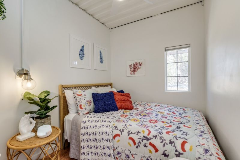 天鵝絨藍色沙發(fā)的后面有一扇隔板,將箱內(nèi)空間間隔了一個小小的睡房。睡床的位置剛好可以嵌套在集裝箱的末端空間里,床邊的一扇小窗創(chuàng)造了流通空氣的條件,躺在床上就能欣賞到天花的工業(yè)風波浪板。