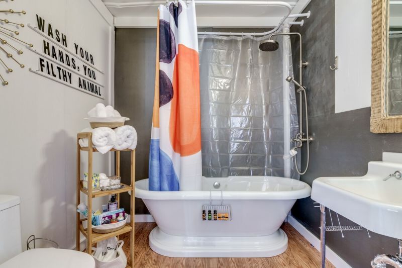 衛(wèi)浴間則設(shè)置在廚房旁的獨立空間內(nèi),一扇小小的玻璃門阻隔了干燥和濕潤的兩個不同環(huán)境。雖然衛(wèi)浴間的空間不大,但依然設(shè)置了一個豪華的獨立浴缸,浴簾可以防止水濺出,慎防地面濕潤滑倒。