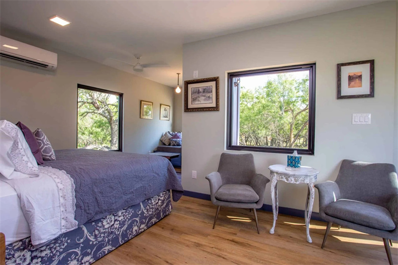 每個集裝箱房屋單元都有一個主臥室,里面配有一張大床,旁邊有一個可以存放衣服的壁櫥。從房子外面你很容易地看到箱體的原始模樣,通過玻璃門窗的設計,你也可以很輕松地在室內觀賞到戶外的景色。