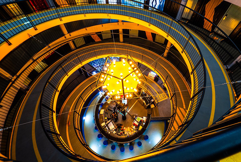 酒店內(nèi)的樓層與樓層之間通過回旋走廊連接,這是酒店的其中一大特色。沒有了熟悉的樓梯,取而代之的是趣味性的坡道,是不是看著就很想來體驗一番?