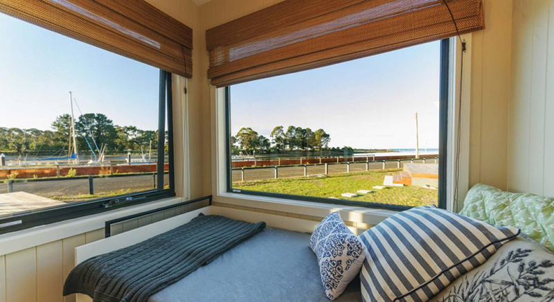 除了在全景玻璃窗的起居室能欣賞到屋外的湖景,廚房旁邊的“閱讀角”也可以。兩面玻璃窗圍繞著一張布藝的沙發床,旁邊的角落是一個白色的書柜。此外,房屋還擁有兩間寬敞的臥室,分別是一間大床房和一間雙床房,每個房間都經過精心設計和建造,以提供最大的舒適度和能源效率。