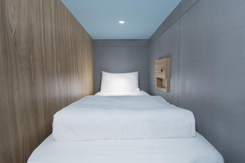 臥室遵循經濟適用原則,一個垂直的空間設置了四個太空睡艙。艙與艙之間以木板相隔,小巧的空間內僅夠放置一張單人睡床。為了保證私密性,床邊的窗簾是可以拉下來的,每張床的頂部還設置了頂燈,這樣就不怕打擾到別人休息了。