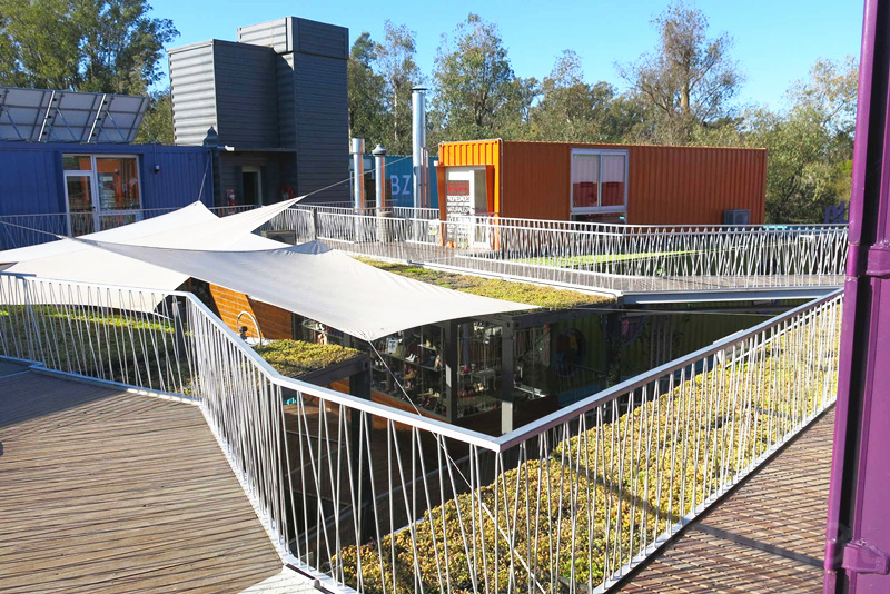 QUO Container Center的設(shè)計(jì)盡求可以做到綠色環(huán)保,大量的開放空間可以利用自然光線,轉(zhuǎn)換率較高的太陽能板也被運(yùn)用到其中,提供電力。二樓部分平臺做了綠化植物的鋪植,隔熱的同時又美觀。
