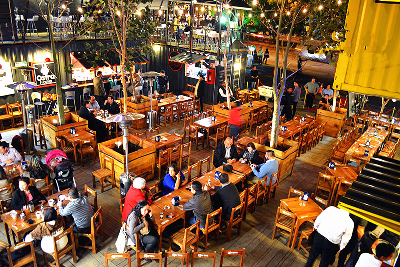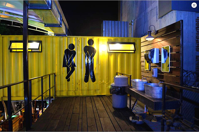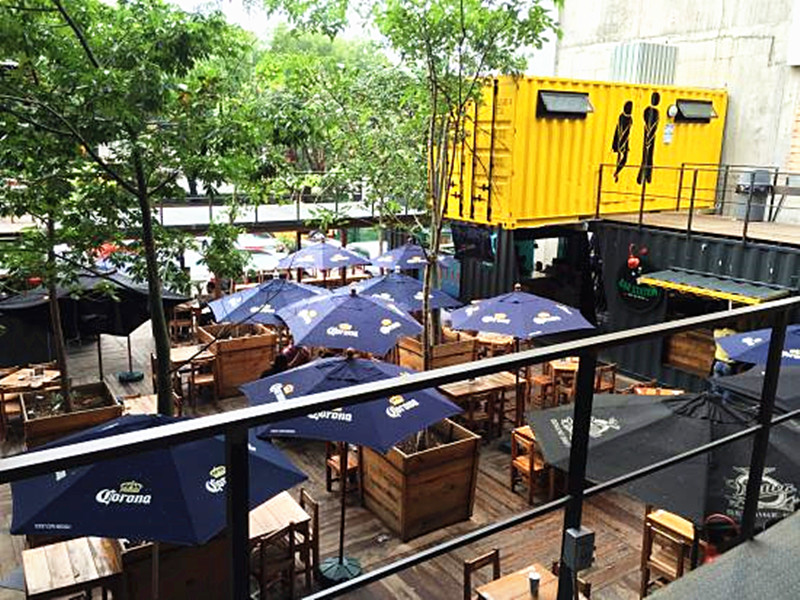 這是一個由集裝箱組建而成的休閑飲食聚集地,主打黑黃色調,黑色經典搭配上明亮的黃色,簡單而不失時尚。一個開放式的休閑飲食中心,造型不一的集裝箱建筑相連接圍成一個兩層的矩形方陣,集裝箱體作為餐廳廚房,中部露天廣場和二層集裝箱頂部作為堂食區供客人使用。