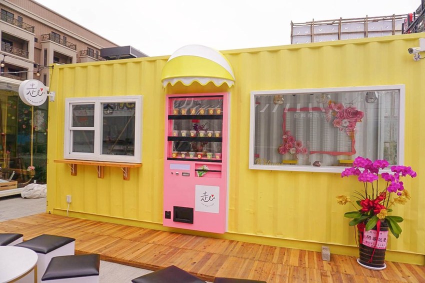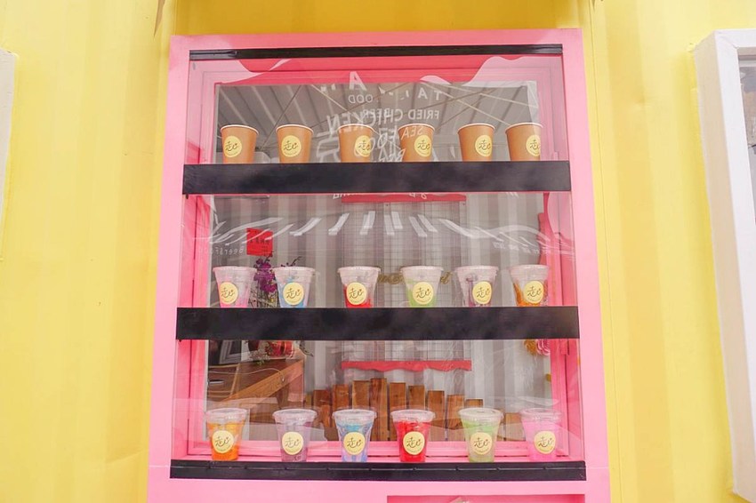走心cafe 是市集里面的一家咖啡店,黃色為主體色調搭配上粉紅色的咖啡售賣機,鋪面而來的小清新風格吸引著游客的眼球。