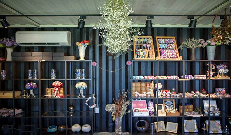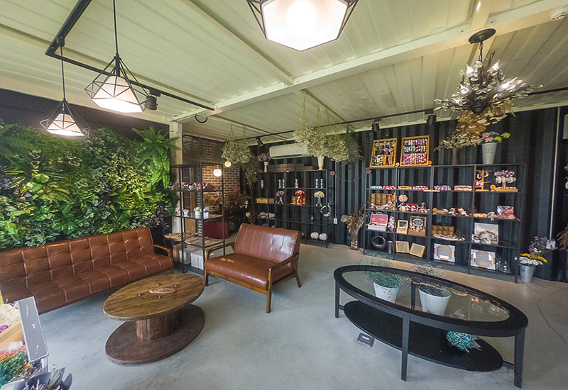 這座手作花坊主要的建筑分為一個紅色的集裝箱和一個黑色的集裝箱,沿著庭院里的小路往里走,從兩箱的交接處進入。黑色的這個集裝箱主要是作為下午茶店使用,箱壁和箱頂都經過精心的設計,箱頂懸掛著不同種類的干花束,營造出滿店都是花的浪漫環境。