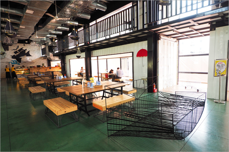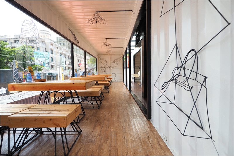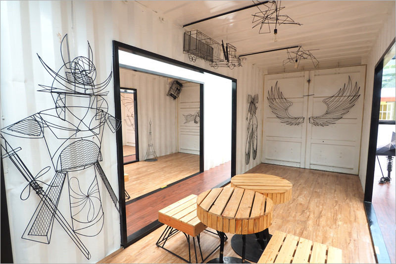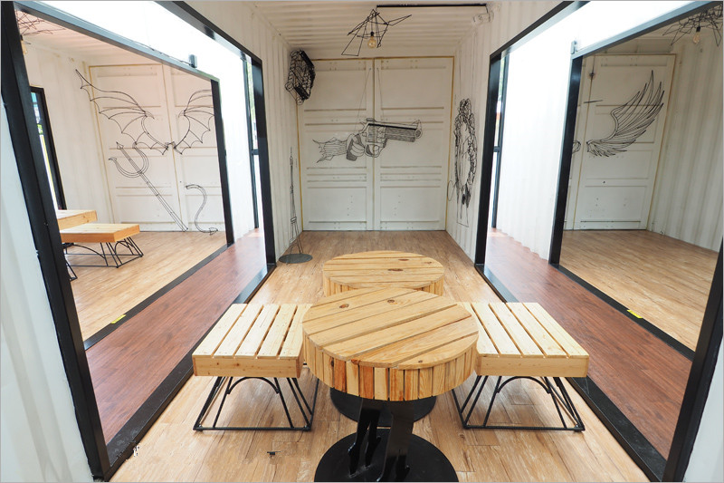 集裝箱內(nèi)采用了大量的木質(zhì)材料和家具,家具采用鐵制的各種造型和木板相結(jié)合,簡約時尚。建筑內(nèi)部是一個復(fù)合式的餐廳,兩層都可供客人使用,墻面都畫上了Q版的經(jīng)典人物圖像,游客可以和這些造型各異的圖像拍照留念。除此以外,園區(qū)還有特別的鐵絲藝術(shù)飾品,鐵絲環(huán)繞成不同的物品造型,獨(dú)特吸引。