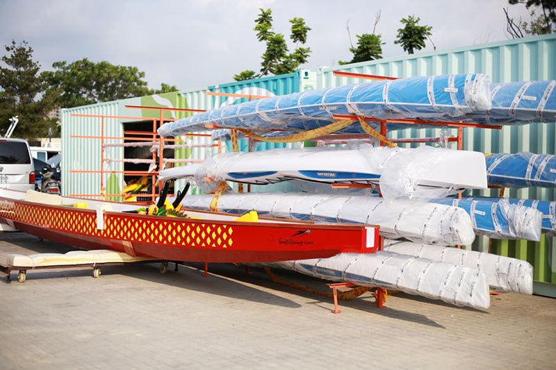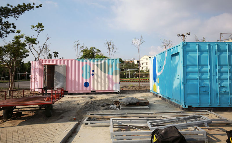 臺中市水利局表示,第五區服務設施創意集裝箱以【花田囍事】作為設計主軸,構想帶入豐原糕餅文化的繁榮意象,打造出5種辨識度高、造型各異的機能集裝箱,為花展帶去不一樣的色彩。