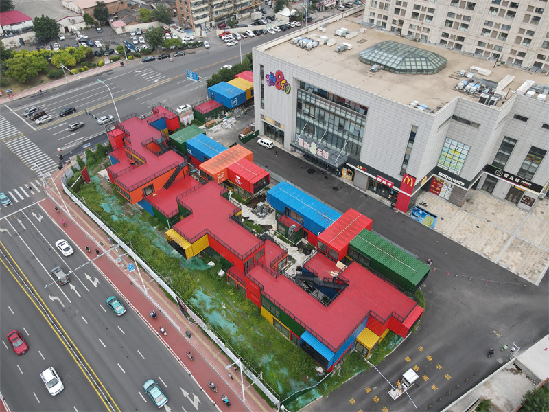 設計師從“街區”概念出發,希望打造一個具有年前社群性、本土話題性、主體沉浸式的文化藝術商業街區,同時也打造了一個集餐飲、休閑、購物、生活、運動于一體的潮聚圣地。雖然集裝箱的組合相對密集,但也盡可能地避免建造封閉式的矩形體量,箱體的部分飄出與架空,使設計更有造型感。