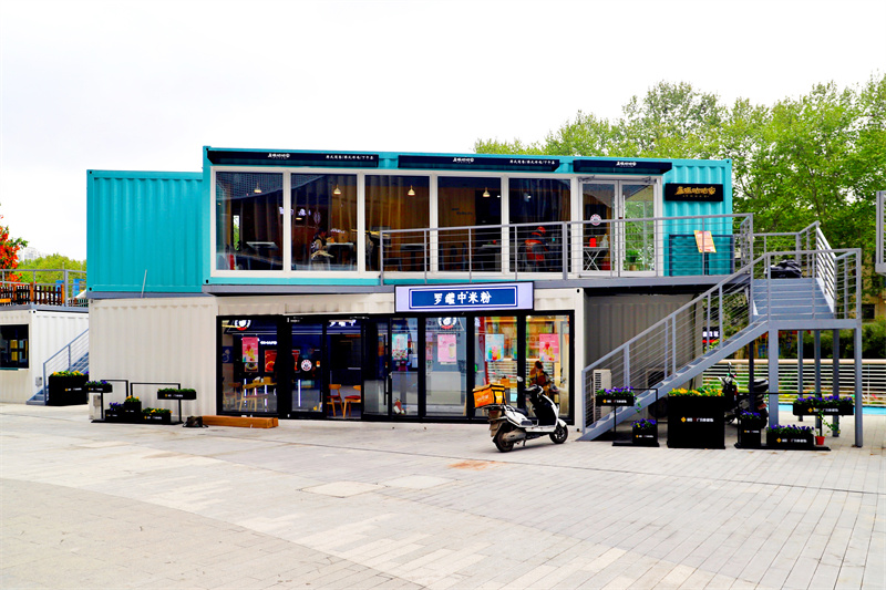 集裝箱商業(yè)街除了有單柜設(shè)計,還有一些兩層樓的多柜商鋪,適用于營業(yè)范圍需求比較寬敞、提供堂食的餐飲店。這座集裝箱由兩層結(jié)構(gòu)組成,上下兩層都采用了集裝箱并排錯開的設(shè)計,外表看上去會產(chǎn)生一種錯落感,體現(xiàn)了箱式建筑堆疊的魅力。