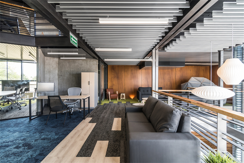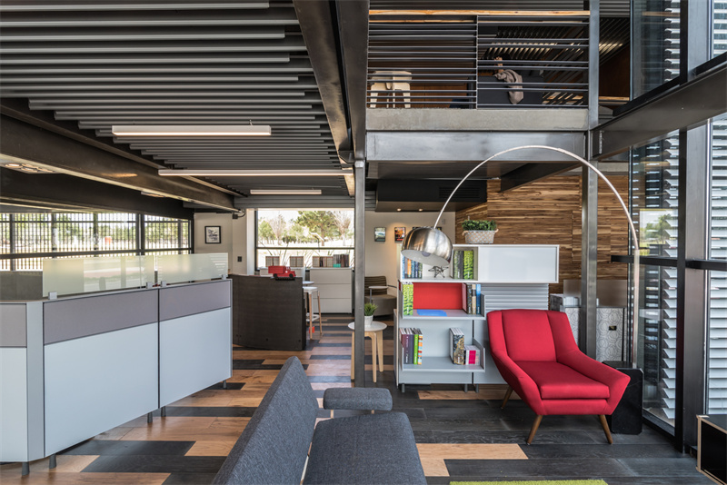辦公空間采用了較為舒適的格調(diào),沒有墨守成規(guī)的辦公桌,卻提供了更自由的活動空間和范圍,讓更多的創(chuàng)意在這里被激發(fā)。天花被一塊塊的金屬片裝飾,營造了集裝箱波浪板的假象,地板由原木和布藝地毯交替鋪設(shè),倍感舒適。整片辦公區(qū)域都充滿了源于玻璃窗外的陽光,讓空間更為明亮。