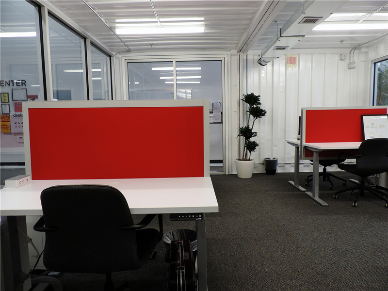 室內是紅色隔板的辦公桌,慣有的簡約格局。由于這個集裝箱辦公室是在室內的,因此并不需要太多的隔熱處理,即使是在辦公室里也能清晰地看到波浪板的紋路。