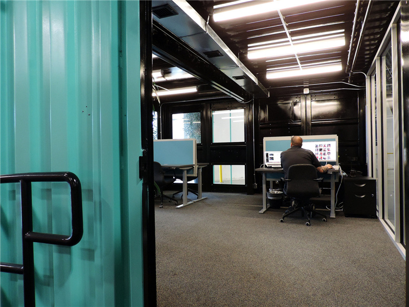 與紅色的集裝箱辦公室不同,這個藍色的集裝箱辦公室的里面采用了黑色的墻面,剛好與白色相對應,給人較為嚴肅的格調。