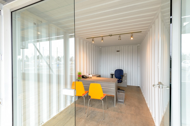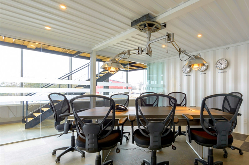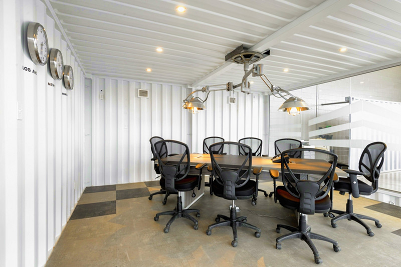 一家工廠的廠房辦公室,干凈利落的兩層式設計,功能區包括經理辦公室、會客室、會議室、廚房等,共利用了12個20尺海運集裝箱改裝搭建而成。淺灰外墻色,簡約而不壓抑。