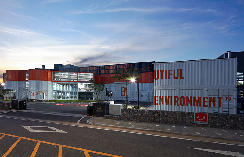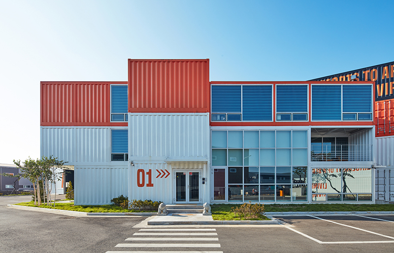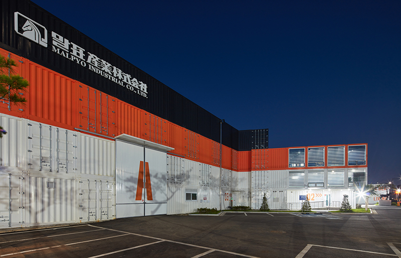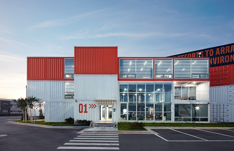你會發(fā)現(xiàn)這所建筑的材料都是熟悉的金屬質感,這是為了要創(chuàng)造一個具有獨特個性的高效建筑空間,其辦公區(qū)域就是用集裝箱建造的。而由于其廠房的規(guī)模龐大,建筑是以鋼架結構為基礎,以集裝箱作為建筑外殼的。