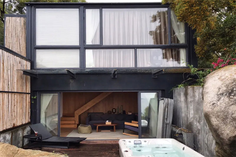 有的房間是一個(gè)完整的集裝箱,比如6號(hào)房,有的是切割之后進(jìn)行了新的改造,有的則是兩個(gè)集裝箱疊加起來(lái)上下打通,比如1號(hào)房。后工業(yè)風(fēng)的集裝箱在萬(wàn)千年的大自然之中,竟然絲毫沒(méi)有違和感,看著這樣的畫(huà)面,仿佛巖石就是建筑的一部分。