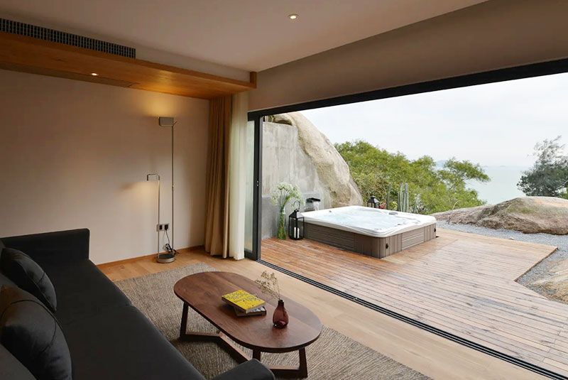 許多房間都有一個(gè)小客廳,外側(cè)則是茂密的樹(shù)林,無(wú)論是在房間里,還是坐在室外喝茶看書(shū),都生活在風(fēng)景里。在露臺(tái)外,擺放著一個(gè)超大的Hotspring專業(yè)按摩浴缸,每天由專人換水持續(xù)恒溫的熱水,隨時(shí)都可以沐浴其中靜觀山海樹(shù)木,感受微風(fēng)拂面...