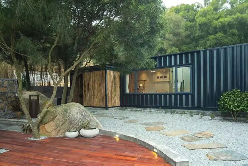 與海不遠(yuǎn),與樹(shù)很近,這家酒店,可以俯瞰對(duì)面整個(gè)沙灘和海景。建筑的主體是集裝箱,除了小木屋改建的8號(hào)房和兩個(gè)用常規(guī)建筑材料改建的7號(hào)房和9號(hào)房,其余的房間包括公共活動(dòng)區(qū)域,都是用集裝箱度身定做。