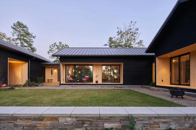 雖然簡單的山墻形式讓人想起該地區的鄉土建筑結構,但場地的選擇基于日本傳統建筑的形式來布局的。采用了石材飾面、木壁板和立縫金屬屋頂板等材料,幫助住宅融入周圍環境。
