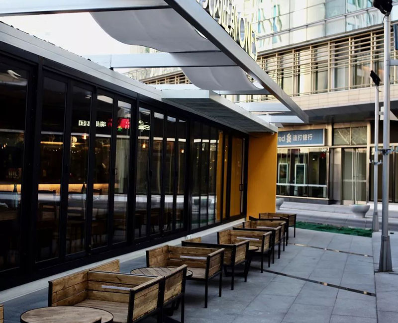 整個餐廳構造由6個集裝箱組裝而成的,因地就勢、造型新穎獨特,占地面積小,前庭后院,提供豐富的戶內外空間。無論是白天還是夜晚,都有著濃郁的時尚現代氛圍。全景落地玻璃,讓就餐的人與街邊路人互為風景,讓人有種仿佛在倫敦街邊的餐館吃飯的感覺。午后,給自己一個空閑,在戶外喝上一杯香醇濃郁的咖啡或一杯桑格麗雅,滿滿的正能量繼續投入工作。