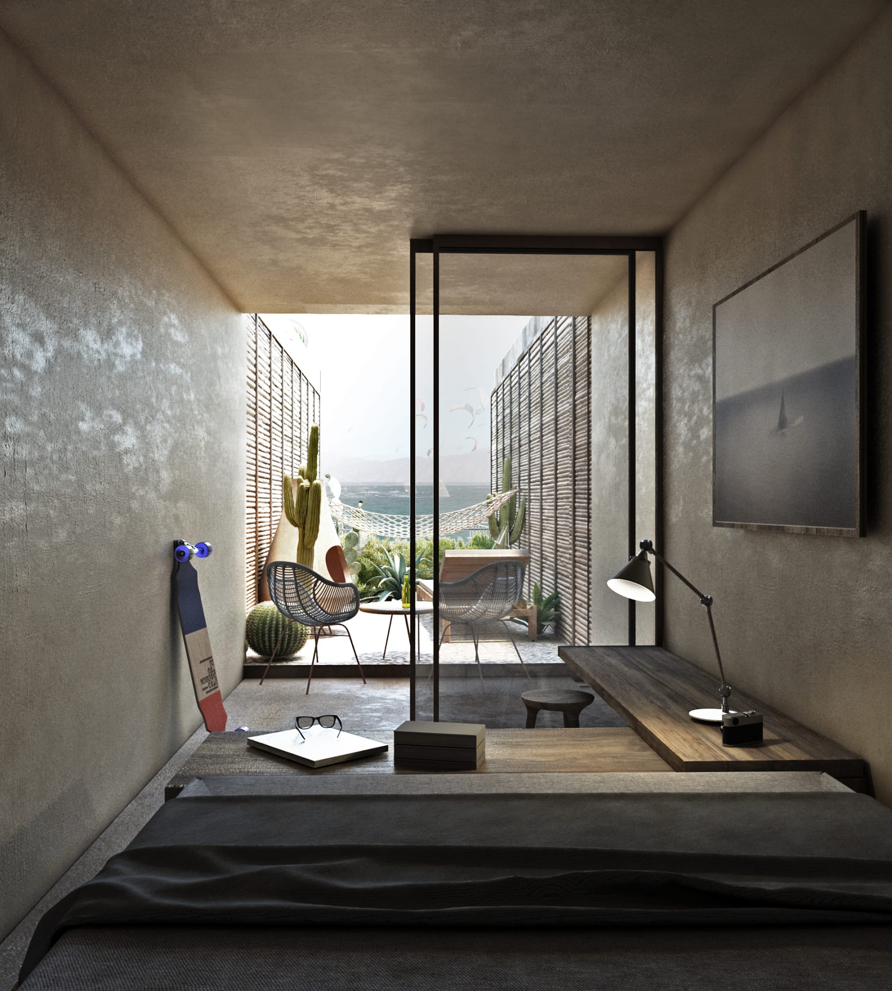 那么出于自身利益的考慮,以及為了能夠減少人類對地球造成的負面影響,我們決定對這些集裝箱進行改造,使其與環境相融合,充分適應場地上的極端溫度條件。具體的操作手法則參照了下加利福尼亞州的傳統建造技藝。