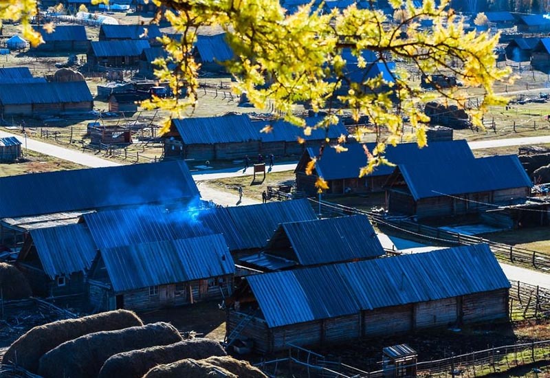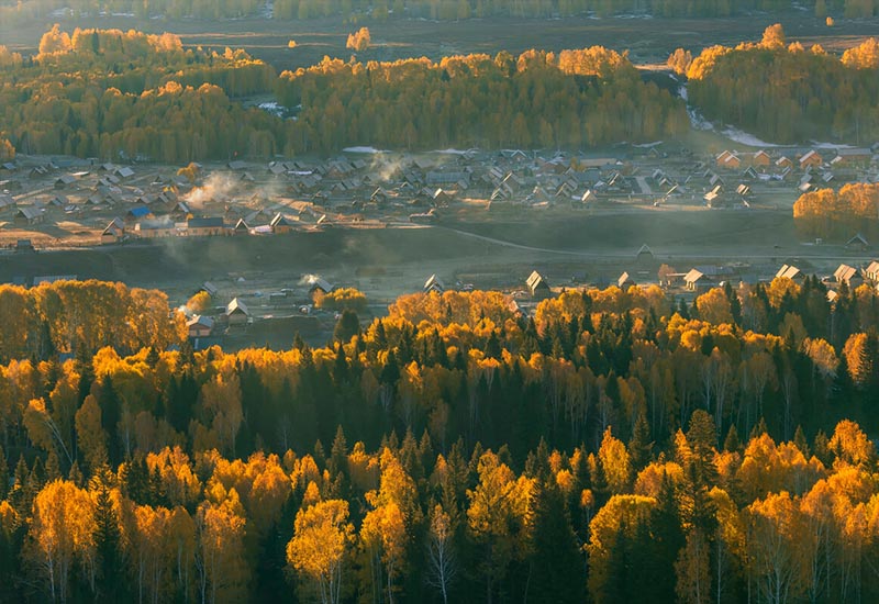 在新疆美麗的喀納斯湖旁,有一個(gè)小小的山村——禾木村,它坐落在崇山阻隔的一個(gè)大河谷里,秋天,放眼望去,都是熱烈而明朗的金黃色——小河、木屋、炊煙、樺林以及禾木橋上放牧的人們。原木壘砌的木屋散布在村落,牧馬人在叢林間揚(yáng)塵而過(guò),萬(wàn)山黃遍的醉人秋色在炊煙中宛若仙境,古樸的山村景致,像喀納斯湖一樣充滿神秘的色彩。