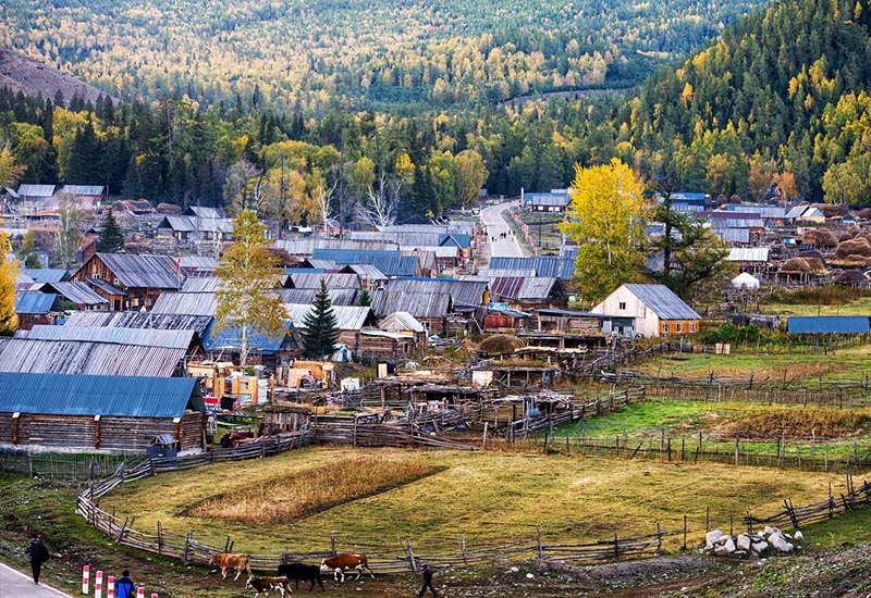 禾木村最惹人注目的就是那一棟棟小木屋和成群結(jié)隊(duì)的牧群與雪峰、森林、草地、藍(lán)天白云構(gòu)成了獨(dú)特的自然文化景觀。牧歸時(shí)分,白樺樹(shù)在夕陽(yáng)的余暉下閃耀著金色的光芒,折射出一幅幅幽美、恬靜、色彩斑斕的俄羅斯油畫(huà)。